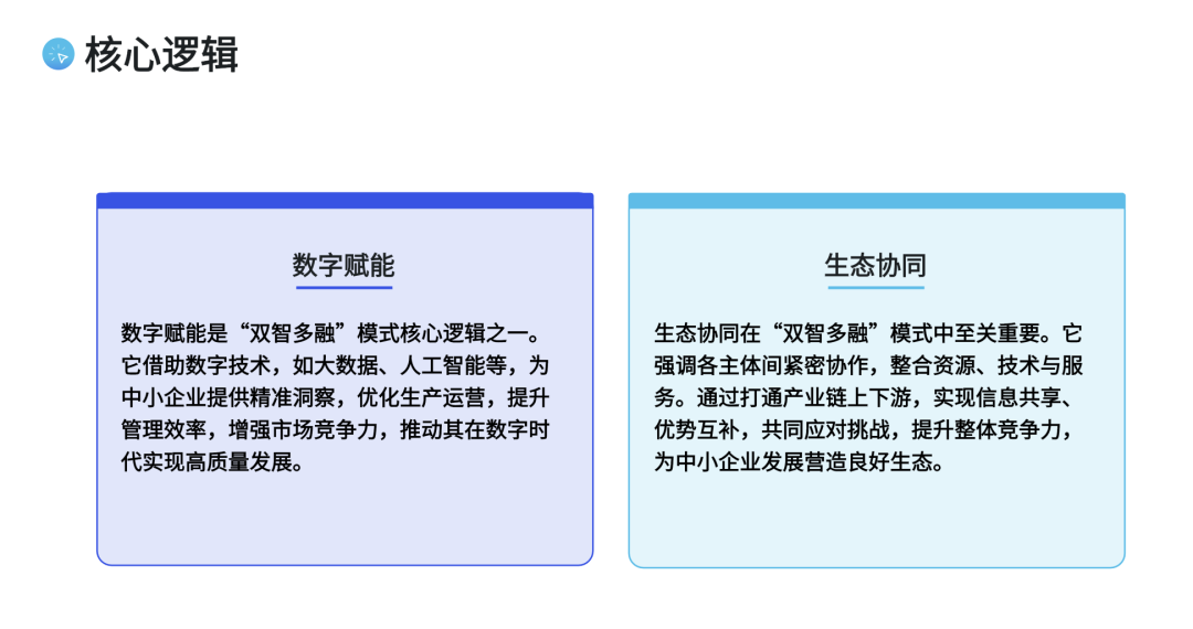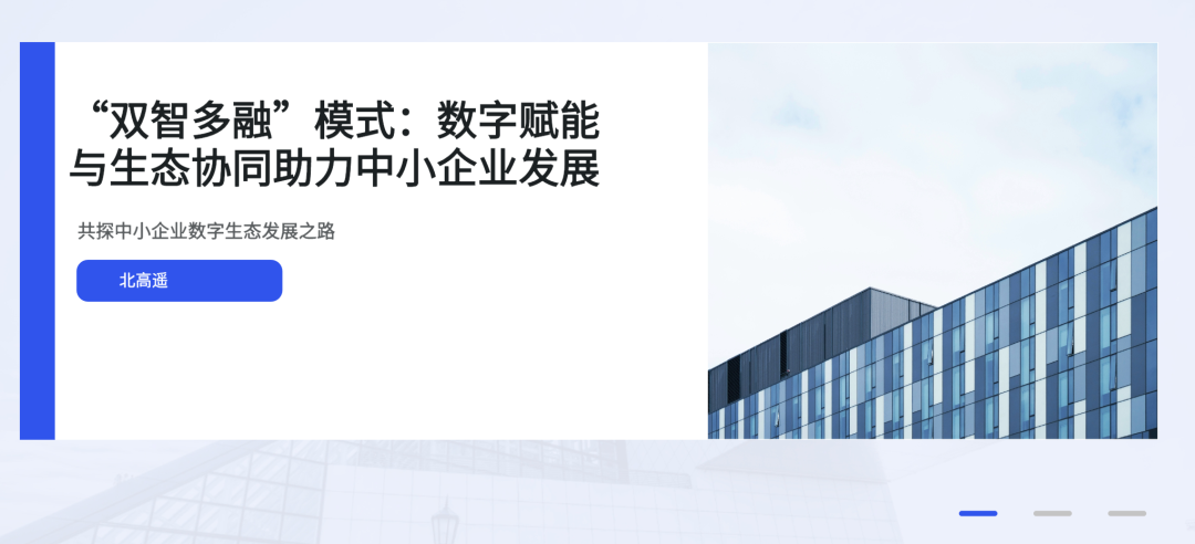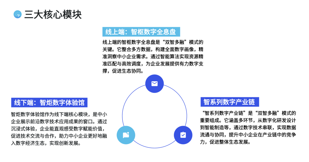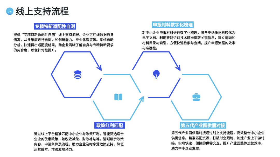 北高遥集团创新推出以“双智多融”为核心的O2O赋能体系,通过“智枢数字全息盘+智炬数字体验馆+智系列数字产业链”的协同布局,搭建线上线下深度融合的服务桥梁,精准破解中小企业在专精特新培育、申报过程中的痛点难点,帮助优秀的创新型企业盘活存量资产,加快资金周转,高效驶入高质量发展的“绿色通道”。“双智多融”模
